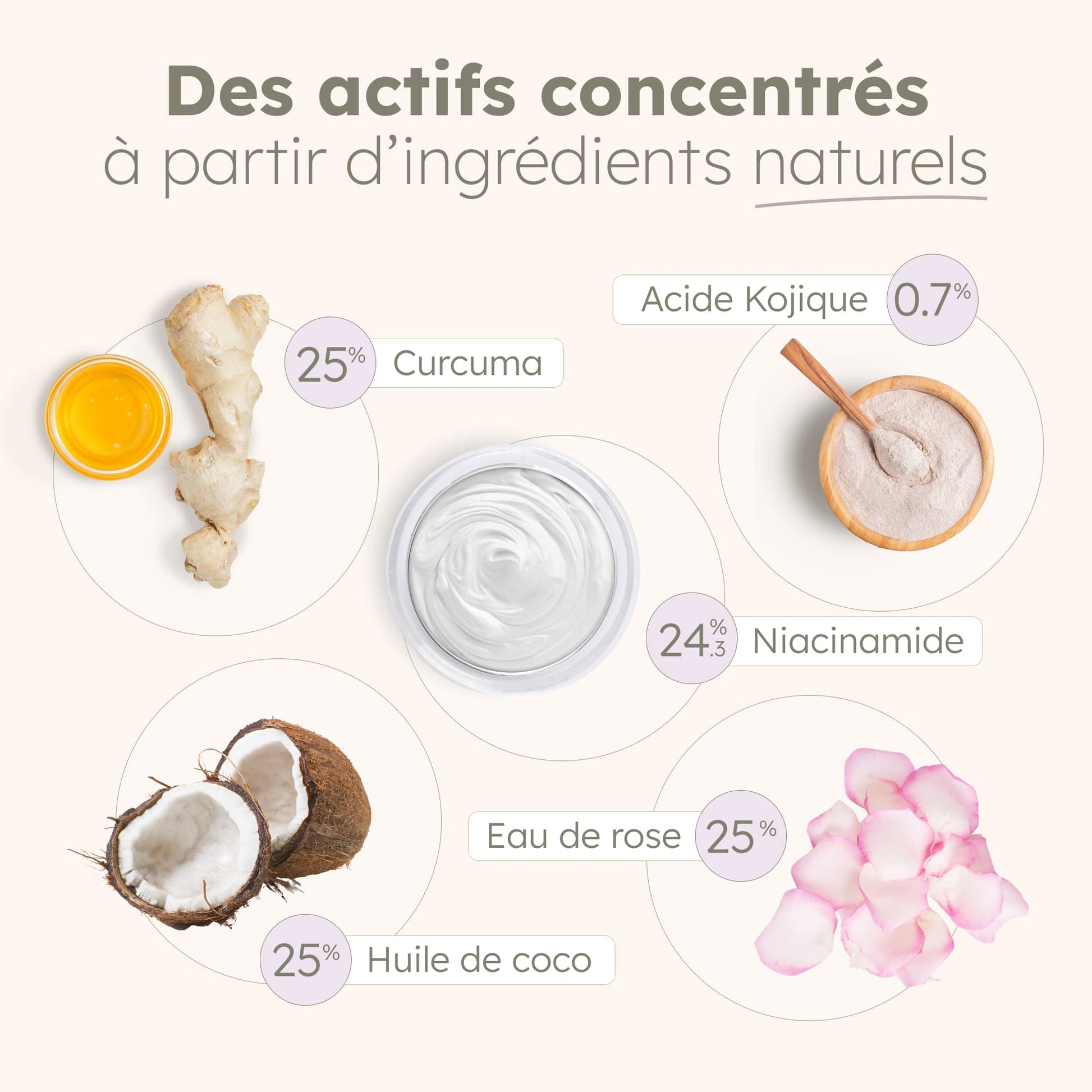 Illuminez votre peau, effacez les imperfections Grâce à l’efficacité prouvée du curcuma, dites adieu aux taches, rougeurs et cicatrices.